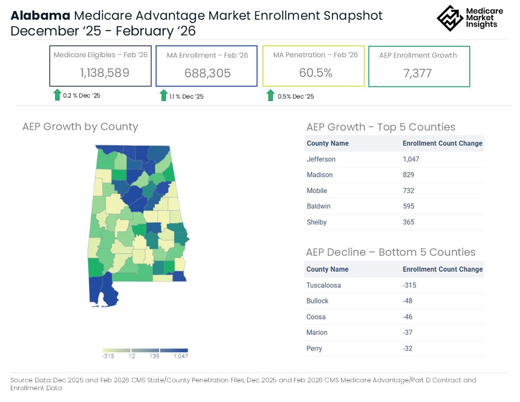 Each page of this eBook contains data visuals highlighting key Medicare Advantage AEP enrollment statistics for each state market, comparing December 2025 to February 2026 enrollment.