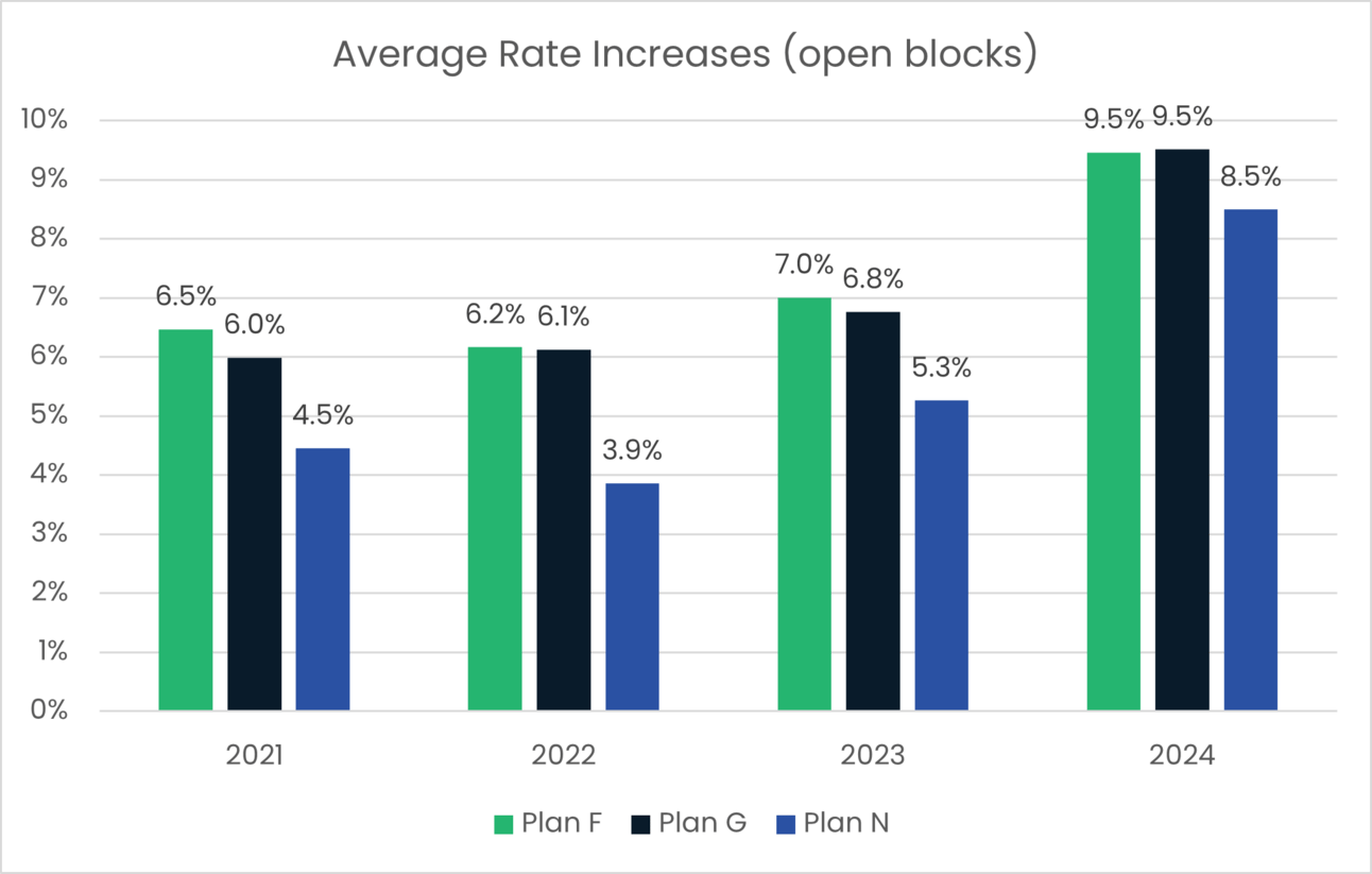 a. 2024 rate increases continue to trend higher than previous years. Approved rate actions are continuing to show a 2% - 3% increase from 2023. The following chart shows the average rate increases on open Med Supp blocks for Plans F, G, and N over the past four years.