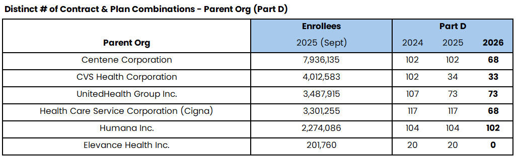 Centene and Health Care Service Corporation (Cigna) account for the majority of Part D plan decreases