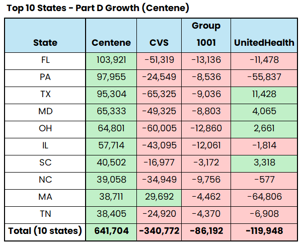 Ten states accounted for half of Centene’s overall Part D growth in 2025. As you can see from the chart below, Centene’s growth in these states likely came from CVS, Group 1001 (Clear Spring Health), and UnitedHealth Group.