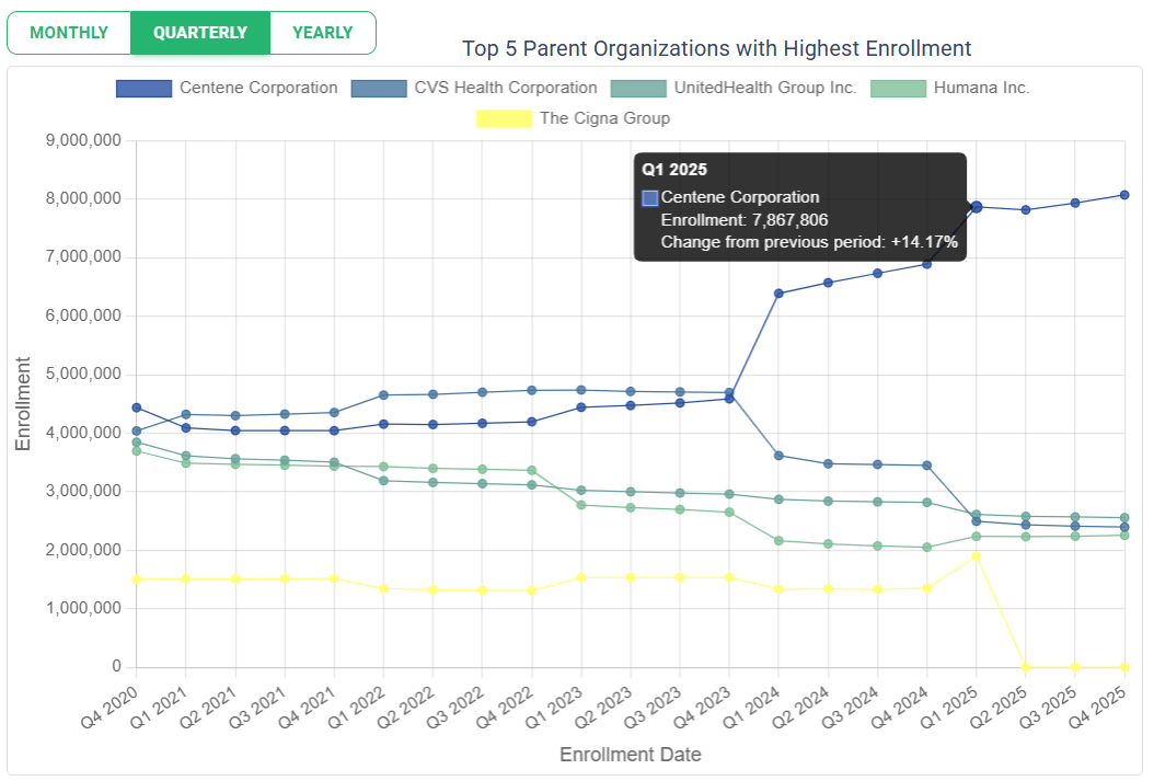 With around 8.1M enrollees, Centene Corporation (“Centene”) topped the Part D market in both enrollment and growth, increasing 17% (1,182,732 enrollees) in 2025 (Dec. ‘24 - Dec. ‘25).