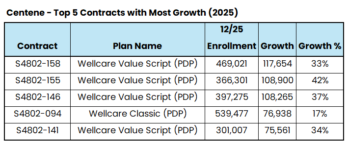 Wellcare Value Script contracts dominated the top 5 contracts with the most growth for Centene in 2025.
