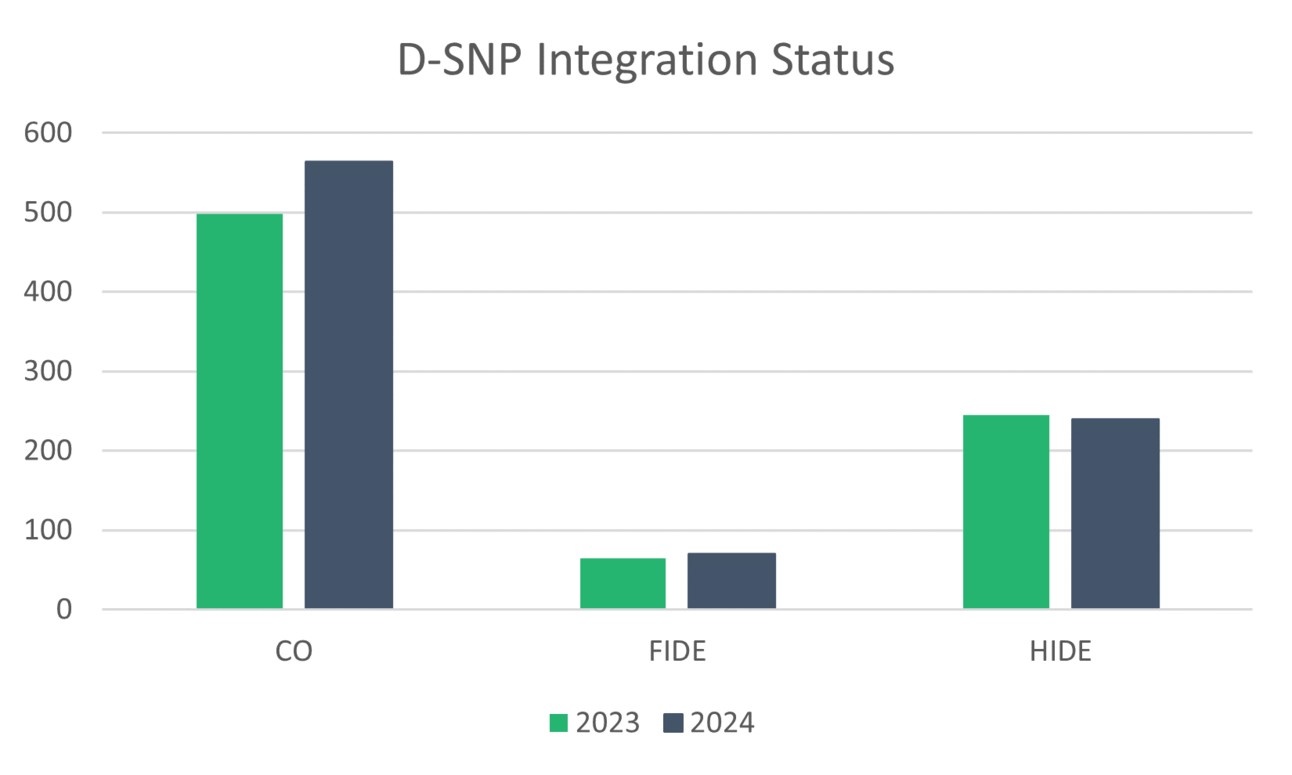 Since 2023, CMS includes integration status in the SNP publicly accessible landscape files. Around 65% of all D-SNP plans are coordination-only D-SNPs (CO). Compared to CO plans which are offered in 39 states, FIDE plans are available in 14 states in 2024, while HIDE plans are available in 17 states.