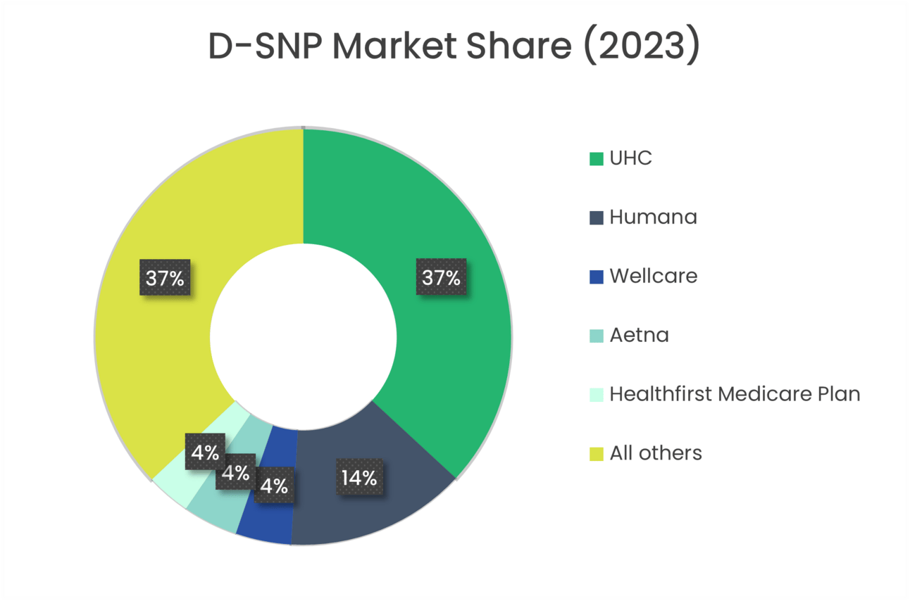 In 2023, 63% of all D-SNP beneficiaries were enrolled with the following 5 carriers: