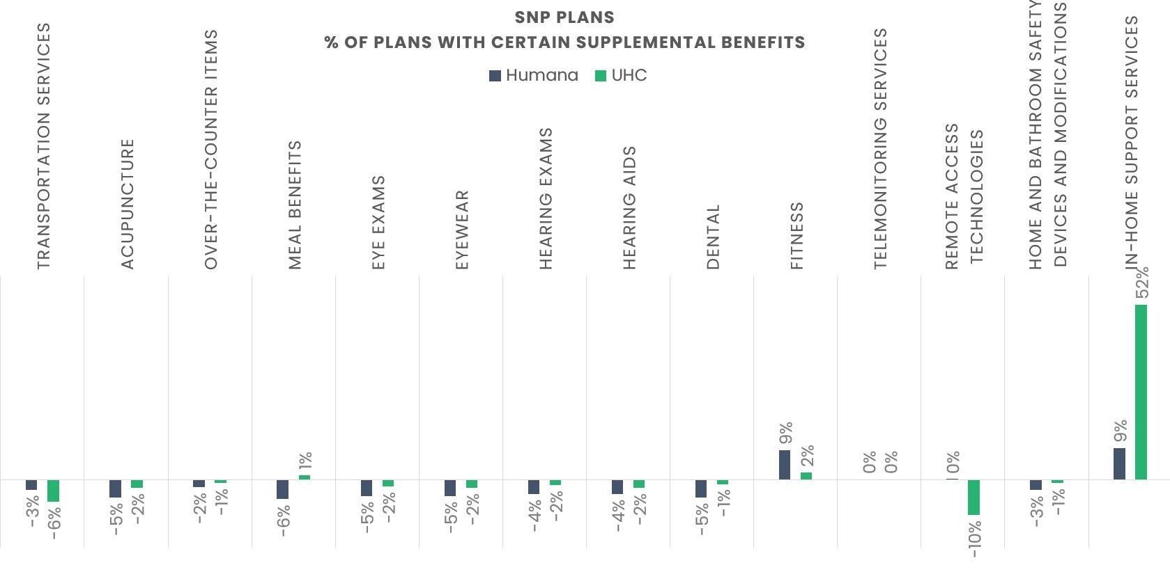 The pattern differs for SNPs. Both Humana and UHC reduced the number of SNPs offering several supplemental benefits in 2026.