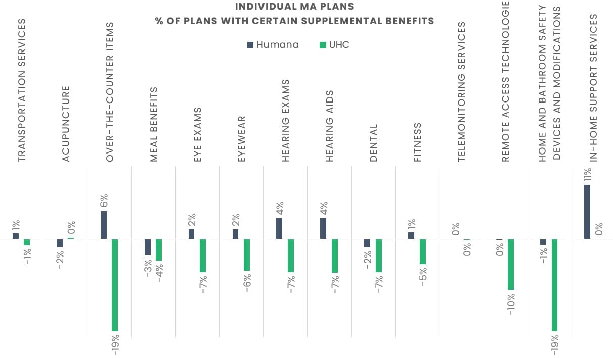 Did supplemental benefits impact AEP success? Let’s take a look at supplemental benefits offered by Humana and UnitedHealth Group, the plans with the largest growth and decline in AEP 2026 respectively.