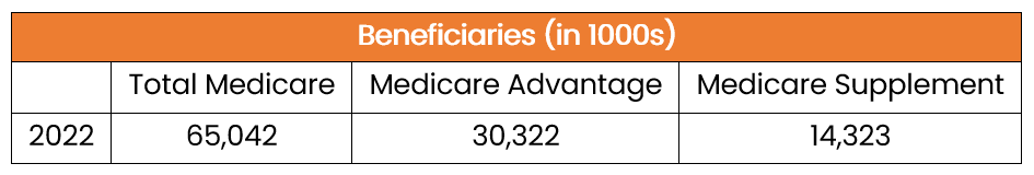 2022 Beneficiary counts for original Medicare, Medicare Advantage plans, and Medicare Supplement insurance are shown below.