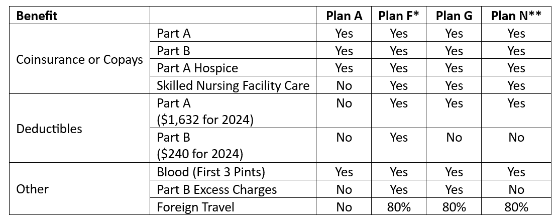 *Plans C and F, which provide coverage for the Part B deductible, aren’t available to beneficiaries who were newly eligible for Medicare on or after January 1, 2020.