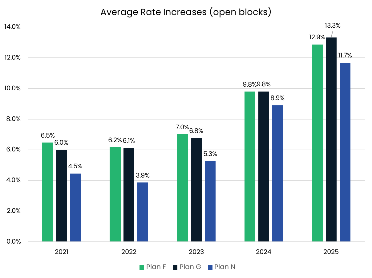→ The following chart shows the average rate increases on open Medigap blocks for Plans F, G, and N over the past four years.