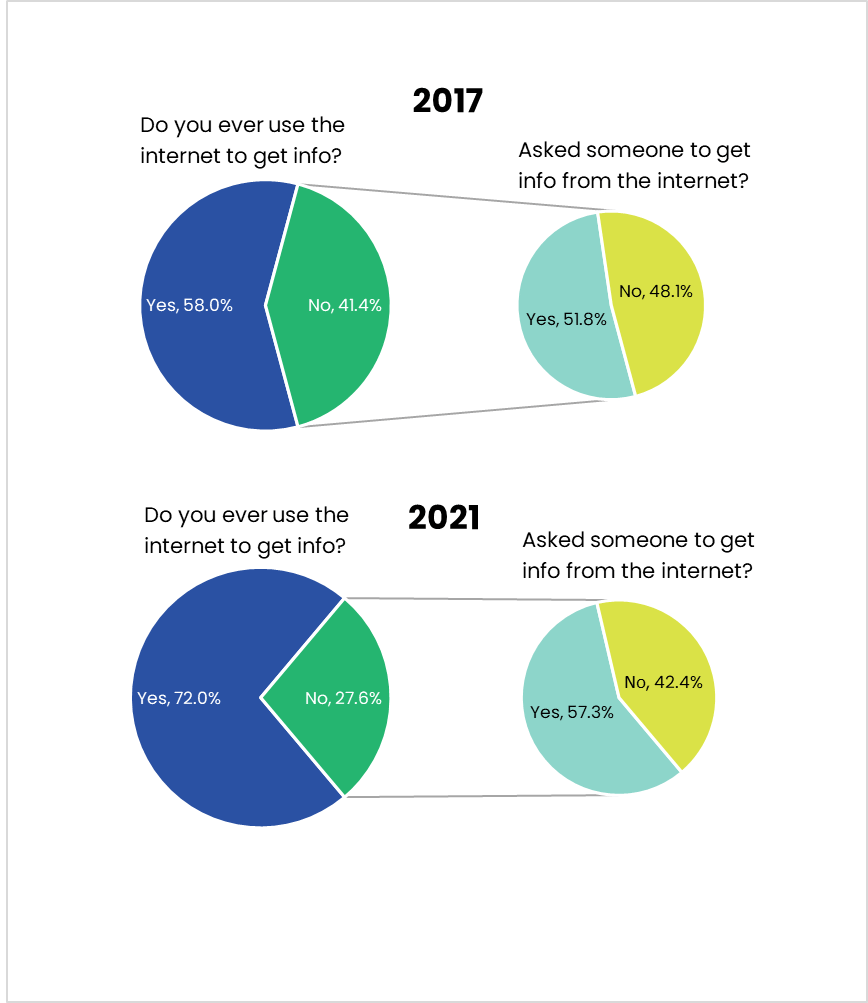 Additionally, for the 41% in 2017 that indicated they do not use the internet, nearly 52% indicated they asked someone to get information from the internet for them, which increased to 57% in 2021.