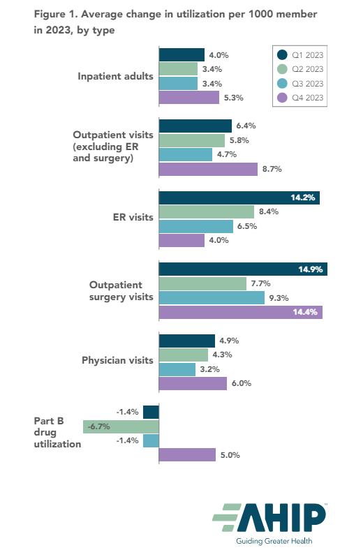 The data visual of the week comes from AHIP, highlighting increased utilization by type in Medicare Advantage during 2023.