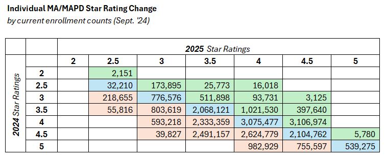 The table below looks at Star Rating changes from 2024 to 2025 (for the plans that are renewing in 2025), and includes the current enrollment in each bucket.