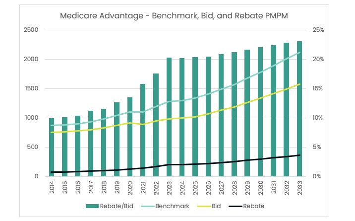 Yet the average PMPM rebate has grown at a rate of 10.3% - how? Well, the Rebate/Bid ratio has doubled, from 10% in 2014, to 20% in 2023.