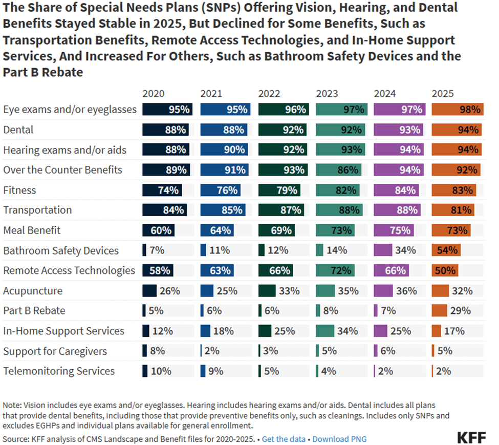 Transportation and Bathroom Safety Device benefits are much more prevalent in SNPs. To a lesser degree, the same is true for In-Home Support and Meal benefits.
