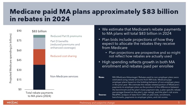 MedPAC estimates that Medicare paid MA plans approximately $83 billion in rebates in 2024. This total “reflects growth in both MA enrollment and rebates paid per enrollee.”