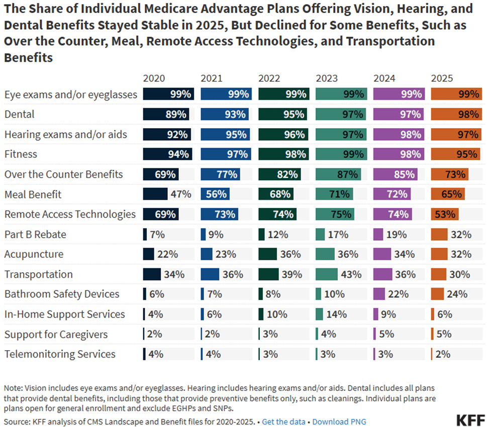 According to survey results reported here and here, the additional benefits in MA plans are viewed as important by beneficiaries, with many reporting that they use those benefits. However, some MA plans have also reported that utilization of supplemental benefits is low, leading to some recent efforts by CMS to collect more data and require more reporting on these benefits for beneficiaries.