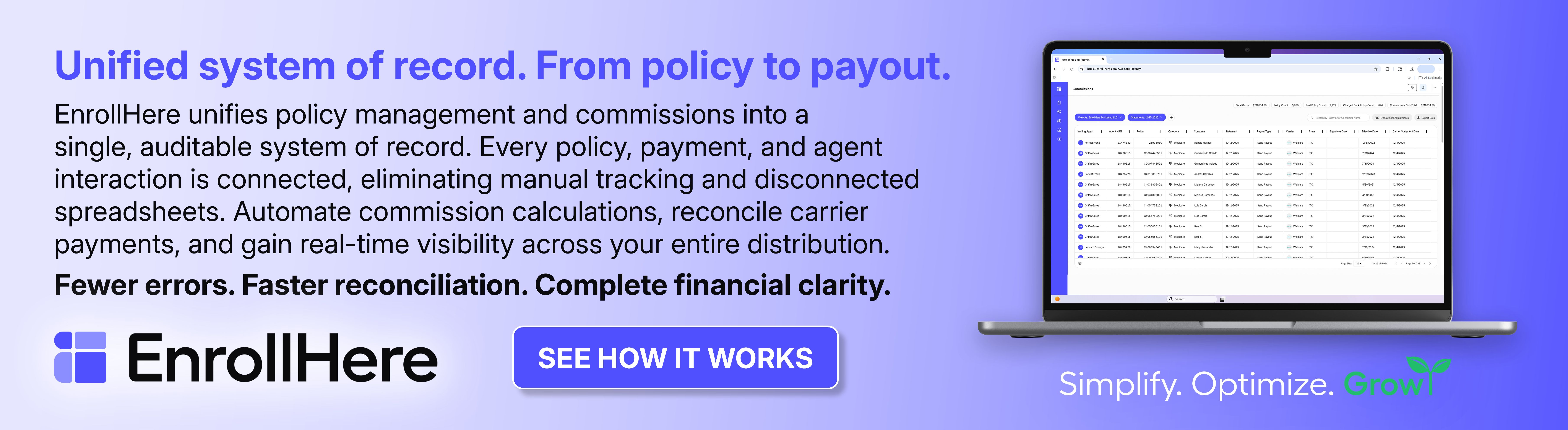 EnrollHere is the system of record for modern insurance distribution, powered by an AI intelligence layer that connects behavioral, operational, compliance, and financial data into one unified platform. We give carriers and agencies complete control across sales, commissions, compliance, and performance, replacing fragmented technology stacks with a single closed-loop system that delivers end-to-end visibility, commission accuracy aligned to carrier payments, and accountable distribution oversight.