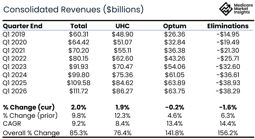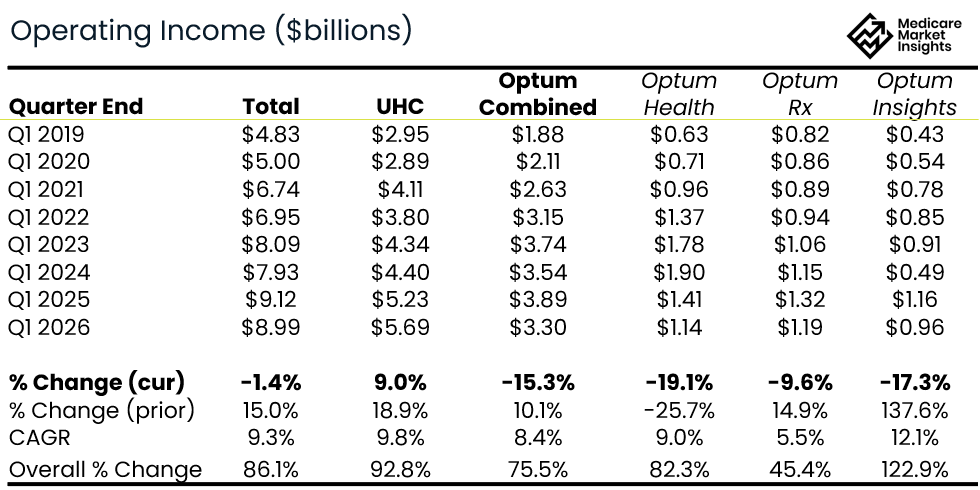 Total Q1 operating income was down slightly. UHC (the Insurance business) operating income increased 9%, Optum saw a meaningful degradation across the board.