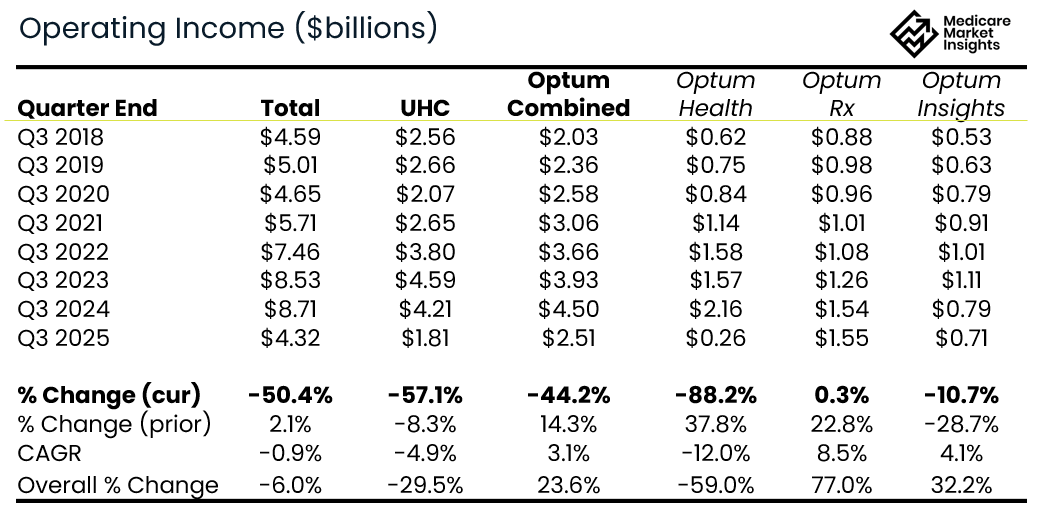 For the first time in seven years, operating income declined across all major segments (except Optum Rx).