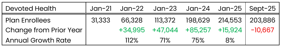 Devoted Health showed strong growth from 2021 through 2023. That growth slowed in 2024 and enrollment counts have decreased during 2025.