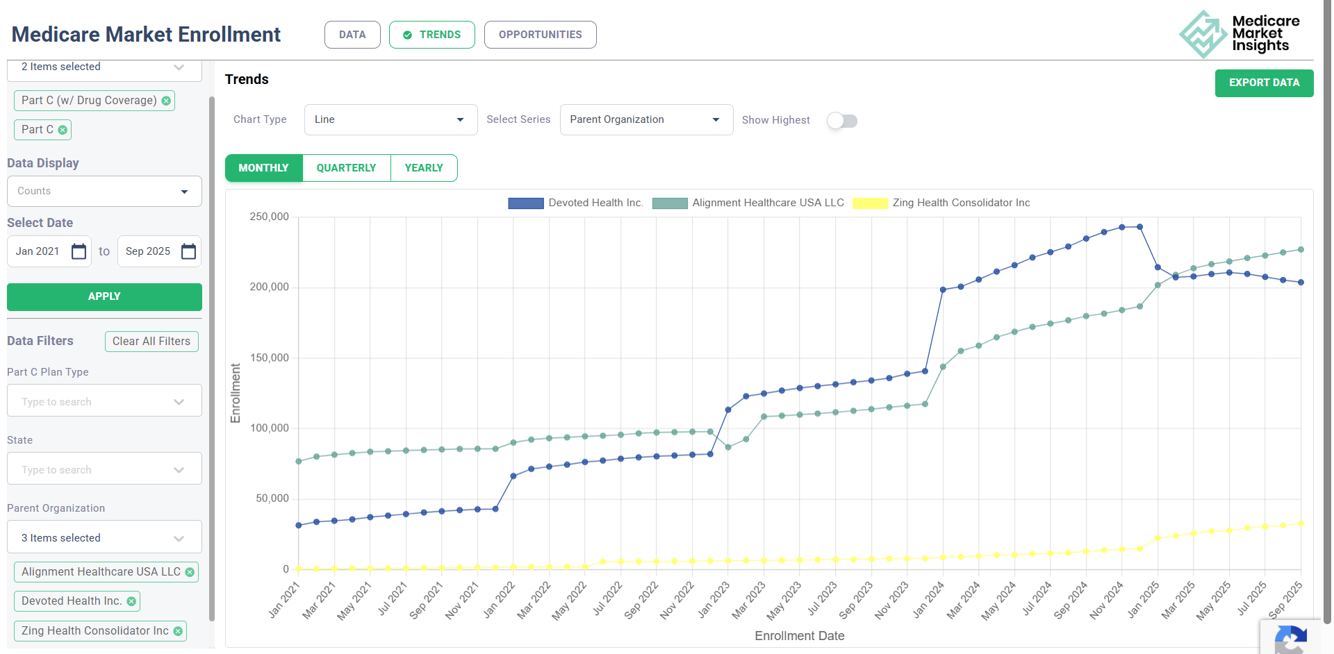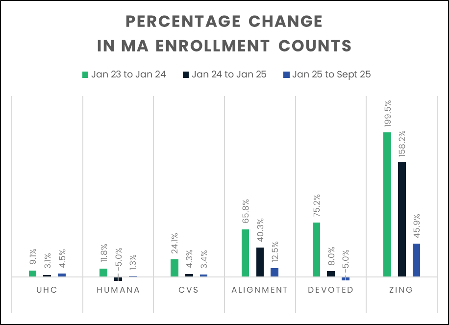 While they have a smaller total member count than Alignment or Devoted, Zing Health has shown solid growth rates since 2021. Their enrollment counts more than doubled from 2023 to 2024 and 2024 to 2025!