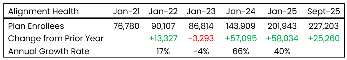 Alignment Health has nearly tripled its enrollment count from Jan 2021 to Sept 2025, despite a small dip in total enrollment from 2022 to 2023.