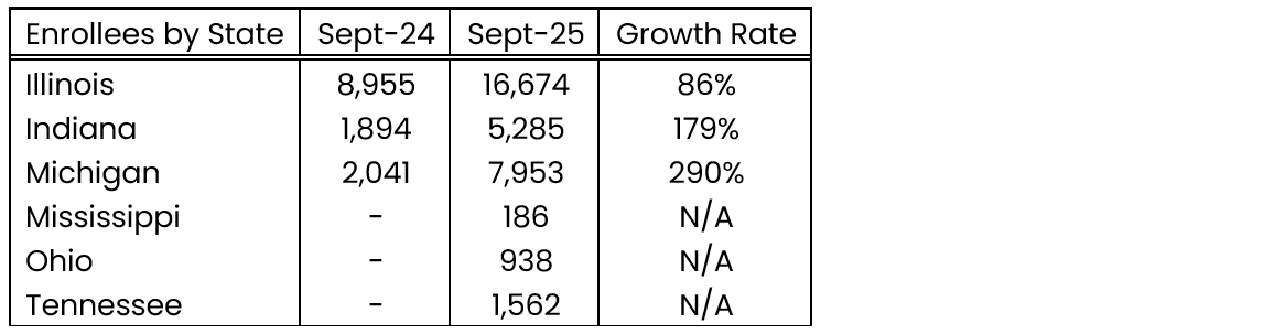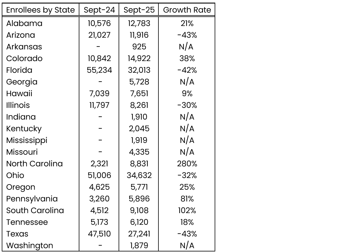 In 2025, Devoted expanded into 7 new states, which now account for just under 10% of their total enrollment. Growth rates by state from September 2024 to September 2025 vary widely from -43% (AZ & TX) up to 280% (NC).
