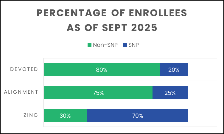 Zing’s business focuses on chronic special needs plans (C-SNPs) which is reflected in the high percentage of enrollment in SNP (70%) for Zing, compared to Alignment and Devoted (20% and 25% respectively).