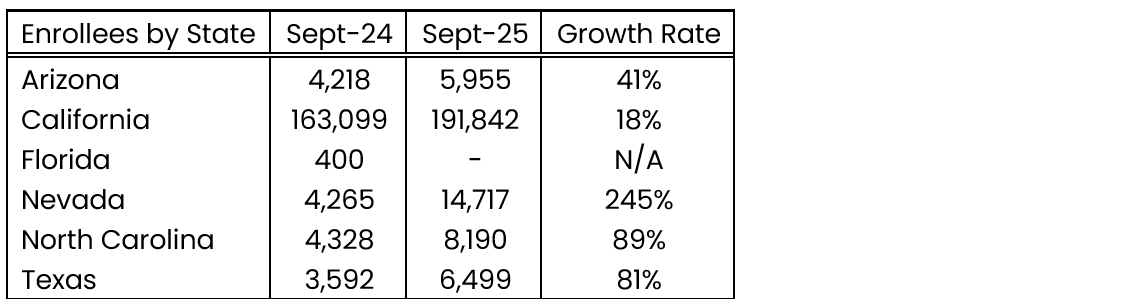 Alignment Health’s footprint and enrollment count by state as of September 2025 compared to September 2024: