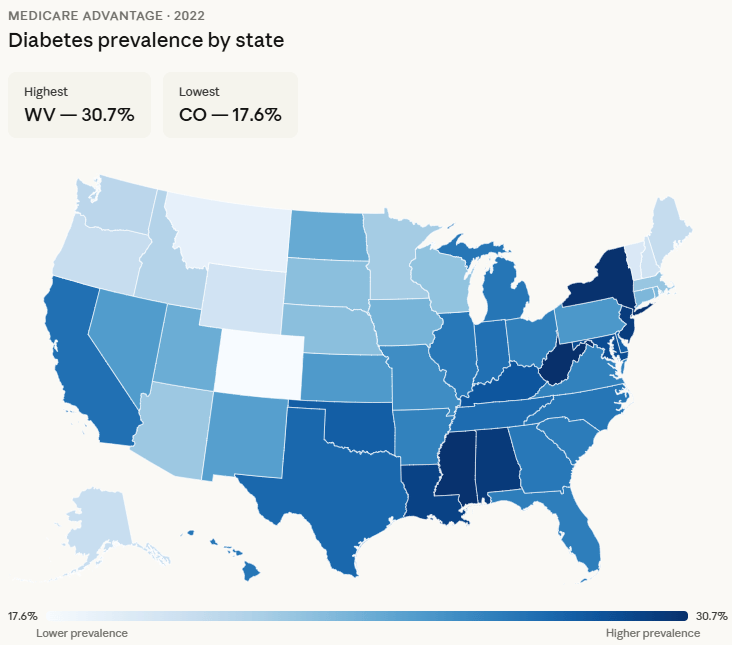 States with highest diabetes prevalence: West Virginia, Mississippi, New York, Alabama, and New Jersey.