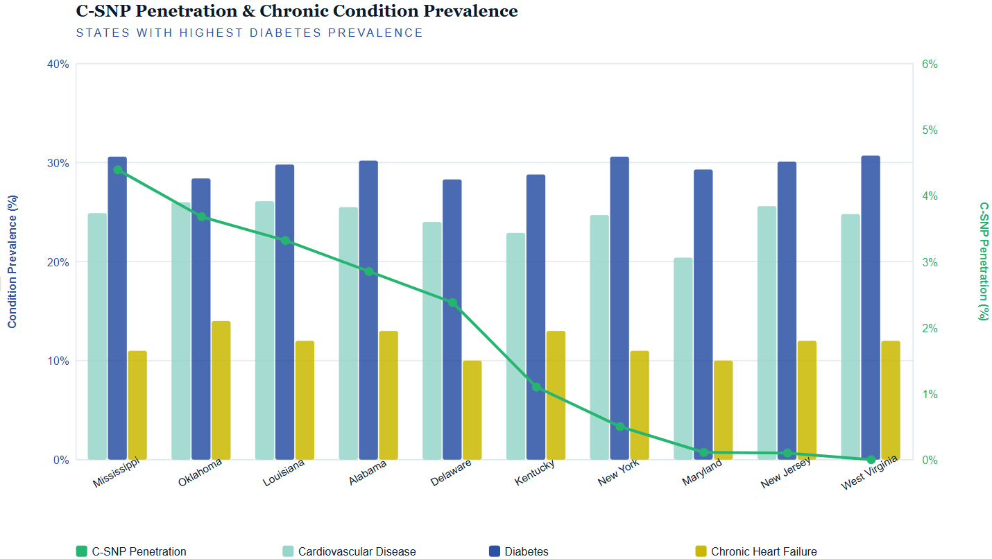 New York, Maryland, New Jersey, and West Virginia stand out - with C‑SNP penetration below 1%, their significantly higher rates of diabetes and cardiovascular disease indicate that beneficiaries in these states are managing more complex chronic health needs. This suggests these markets may offer stronger C‑SNP growth potential than raw enrollment figures alone would indicate.