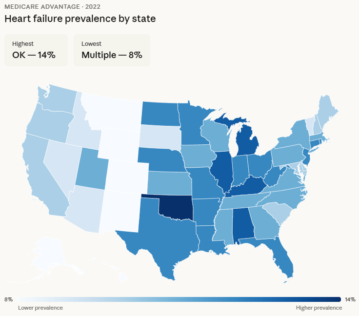 States with highest heart failure prevalence: Oklahoma, Alabama, Kentucky, Michigan, and Illinois.